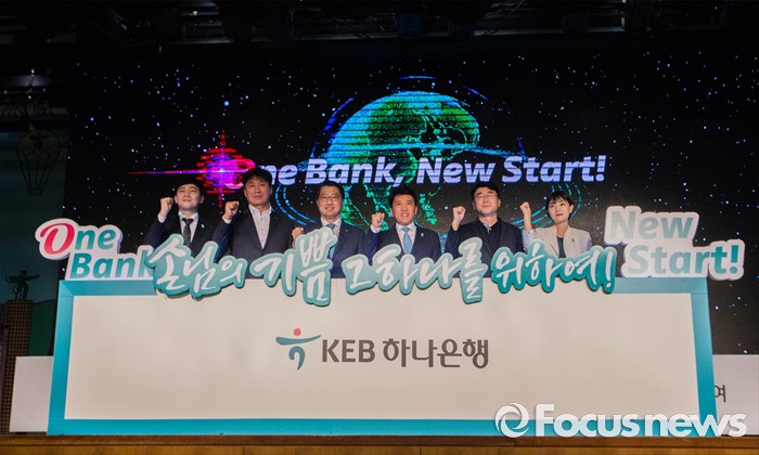 (서울=포커스뉴스) 13일 오후 서울 중구 KEB 하나은행 본점에서 열린 'One Bank, New Start' 선언식에 참석한 주요 내빈과 임직원들이 새로운 출발의 결의를 다지며 구호를 외치고 있다. 좌측 두번째부터 김창근 노조위원장, 진웅섭 금융감독원장, 함영주 KEB 하나은행장, 김근용 한국외환은행지부 노조위원장