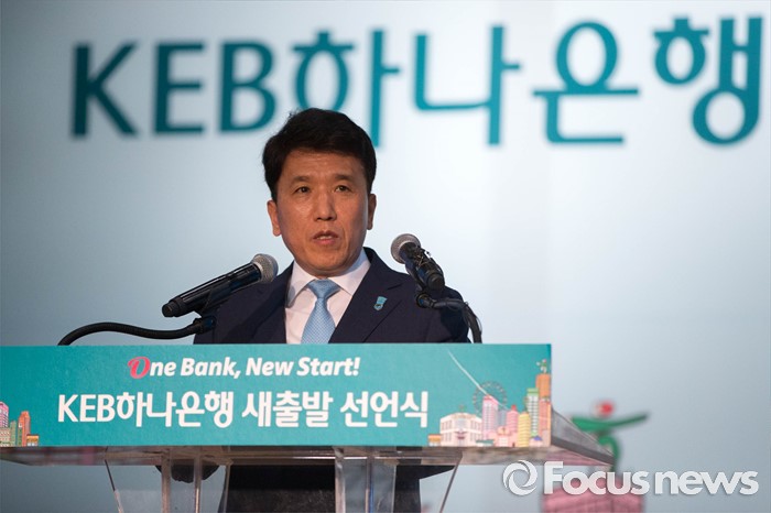 (서울=포커스뉴스) 13일 오후 서울 중구 KEB 하나은행 본점에서 열린 'One Bank, New Start' 선언식에 참석한 함영주 KEB 하나은행장이 축사를 하고 있다.