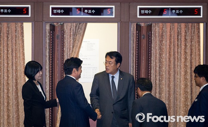 (서울=포커스뉴스) 13일 오후 서울 여의도 국회에서 상임위원장 선출을 위해 열린 343회 국회(임시회) 2차 본회의에 참석한 정진석 새누리당 원내대표가 투표 후 원유철 전 원내대표와 인사하고 있다.