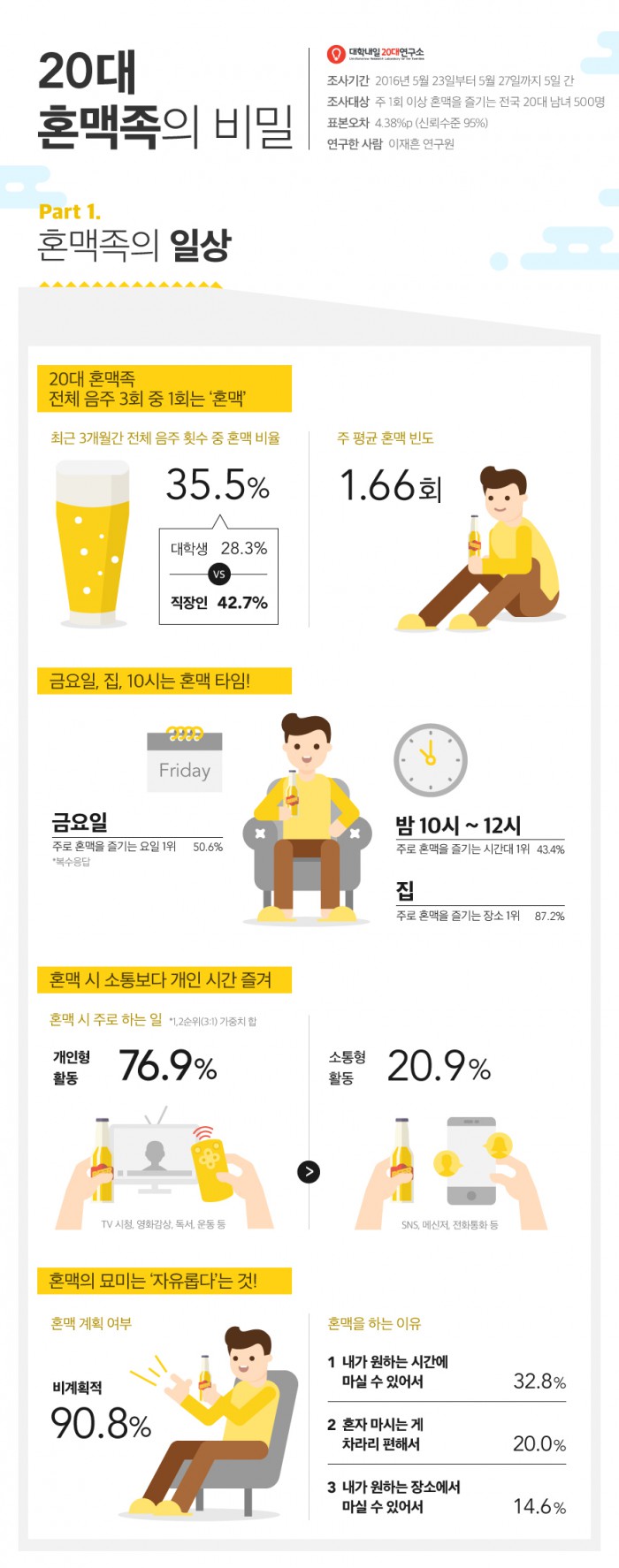 이에 따르면, 20대 혼맥족의 전체 음주 횟수 중 혼맥이 차지하는 비율은 35.5%였다. 3번 중 1번 꼴로 혼맥을 즐기는 셈이다.