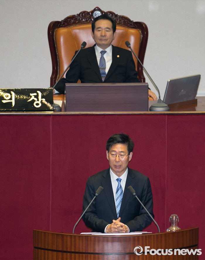 (서울=포커스뉴스) 13일 오후 서울 여의도 국회에서 열린 343회 국회(임시회) 2차 본회의에 참석한 양승조 신임 보건복지위원장이 당선 인사를 하고 있다.
