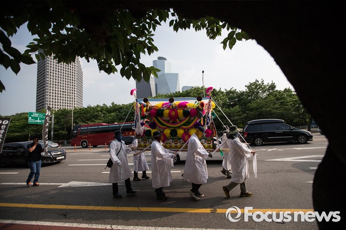 (서울=포커스뉴스) 13일 오후 유성기업 노동자 故 한광호씨의 분향소를 양재동 현대차 본사 앞으로 옮기는 꽃길 100리 행진에 참여한 노동자들이 시청 분향소를 떠나 국회를 향하고 있다.