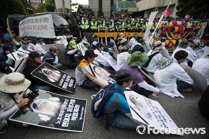 (서울=포커스뉴스) 13일 오후 유성기업 노동자 故 한광호씨의 분향소를 양재동 현대차 본사 앞으로 옮기는 꽃길 100리 행진에 참여한 노동자들이 시청 분향소에서 출발해 국회로 행진하던 중 더불어 민주당 당사 앞에 멈춰 집회를 하고 있다.