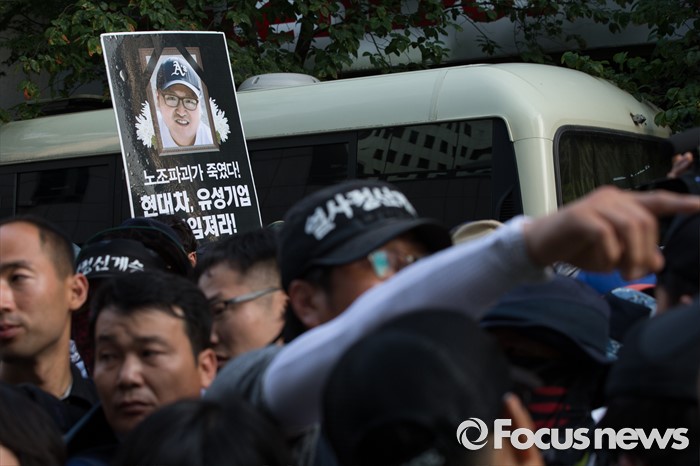 (서울=포커스뉴스) 13일 오후 유성기업 노동자 故 한광호씨의 분향소를 양재동 현대차 본사 앞으로 옮기는 꽃길 100리 행진에 참여한 노동자들이 시청 분향소에서 출발해 국회로 행진하던 중 더불어 민주당 당사 앞에서 경찰과 대치하고 있다.