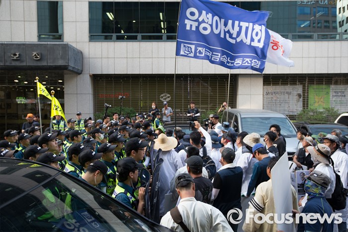 (서울=포커스뉴스) 13일 오후 유성기업 노동자 故 한광호씨의 분향소를 양재동 현대차 본사 앞으로 옮기는 꽃길 100리 행진에 참여한 노동자들이 시청 분향소에서 출발해 국회로 행진하던 중 더불어 민주당 당사 앞에서 경찰과 대치하고 있다.