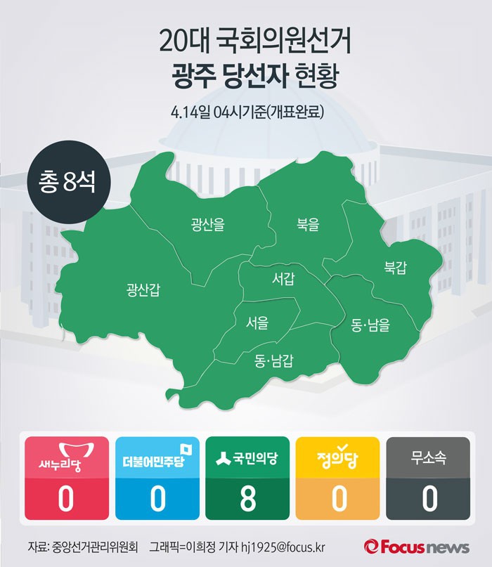 광주의 8개 선거구를 모두 차지한 것은 국민의당으로 더불어민주당은 단 한석도 얻지 못했다.