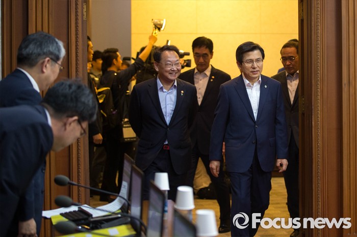 (서울=포커스뉴스) 황교안(오른쪽) 국무총리와 유일호 경제부총리가 14일 오전 서울 종로구 정부서울청사에서 열린 국무회의에 참석하고 있다.