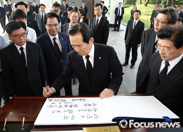 (서울=포커스뉴스) 정세균 국회의장이 14일 오전 동작구 국립서울현충원을 방문해 참배를 마친 뒤 방명록을 작성하고 있다.