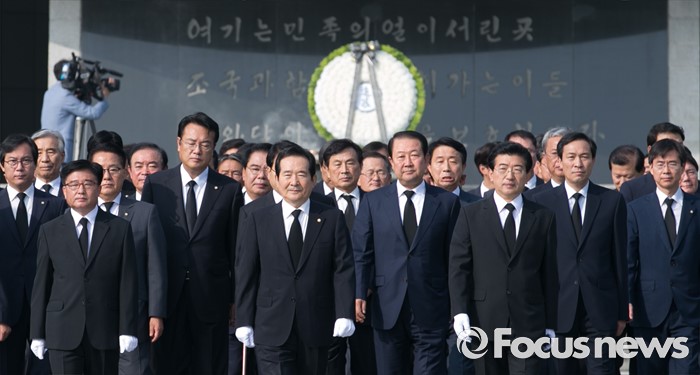 (서울=포커스뉴스) 정세균 국회의장과 정진석 새누리당 원내대표, 우상호 더불어민주당 원내대표, 박지원 국민의당 원내대표, 20대 국회 전반기 상임위원장들이 14일 오전 동작구 국립서울현충원을 방문해 참배를 마친 뒤 이동하고 있다.