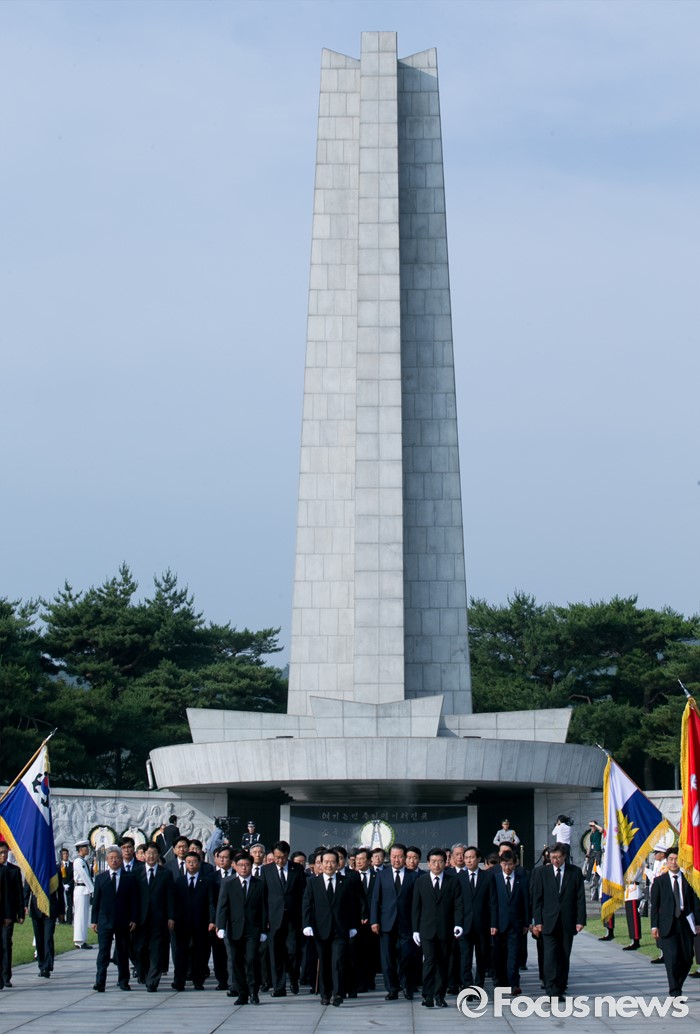 (서울=포커스뉴스) 정세균 국회의장과 정진석 새누리당 원내대표, 우상호 더불어민주당 원내대표, 박지원 국민의당 원내대표, 20대 국회 전반기 상임위원장들이 14일 오전 동작구 국립서울현충원을 방문해 참배를 마친 뒤 이동하고 있다.