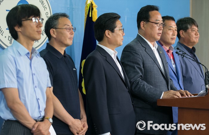 (서울=포커스뉴스) 어기구(오른쪽 세번째) 더불어민주당 의원과 충남 석탄화력발전소 설치지역 관련 기초단체장들이 14일 오전 서울 여의도 국회 정론관에서 미세먼지 대책관련 공동 기자회견을 하고 있다.