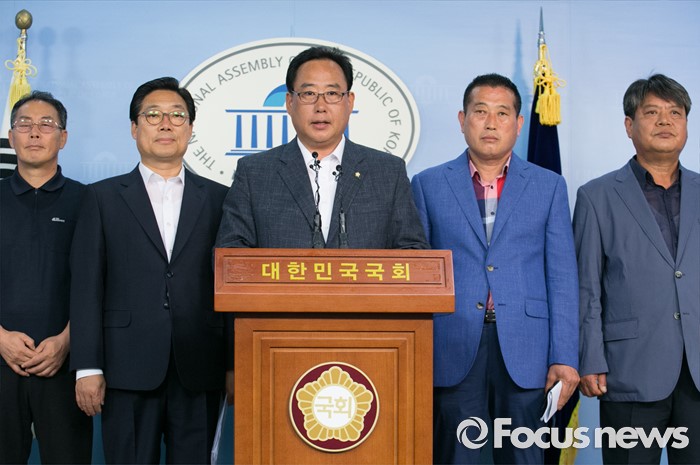 (서울=포커스뉴스) 어기구(오른쪽 세번째) 더불어민주당 의원과 충남 석탄화력발전소 설치지역 관련 기초단체장들이 14일 오전 서울 여의도 국회 정론관에서 미세먼지 대책관련 공동 기자회견을 하고 있다.