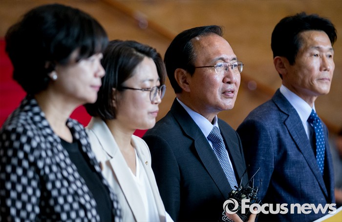 (서울=포커스뉴스) 노회찬 정의당 원내대표와 의원들이 14일 오전 서울 여의도 국회 로텐더홀 계단 앞에서 상임위 배정과 관련 기자회견을 하고 있다. 왼쪽부터 이정미 원내수석부대표, 추혜선 의원, 노 원내대표, 윤소하 의원.