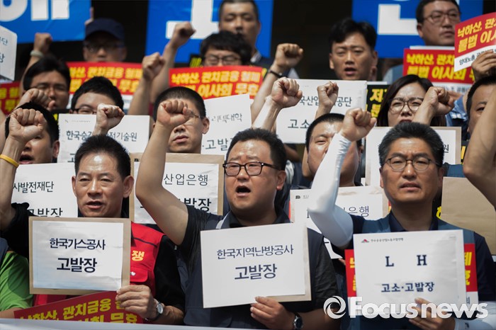 (서울=포커스뉴스) 14일 오전 서울 종로구 세종문화회관 앞에서 양대노총 공공부문공대위가 주최하는 '성과연봉제 중단 촉구 및 공공기관장 워크숍 규탄 기자회견'이 열리고 있다.