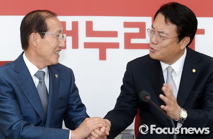(서울=포커스뉴스) 정진석(오른쪽) 새누리당 원내대표가 14일 오전 서울 여의도 국회를 방문한 이원종 대통령비서실장과 면담에 앞서 악수하고 있다.