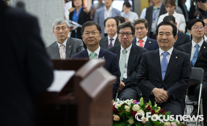 (서울=포커스뉴스) 정세균(앞줄 오른쪽) 국회의장과 천정배(앞줄 오른쪽 두번째) 국민의당 공동대표가 14일 오전 서울 여의도 국회 의원회관에서 열린 국회도서관 박람회 개막식에 참석하고 있다.