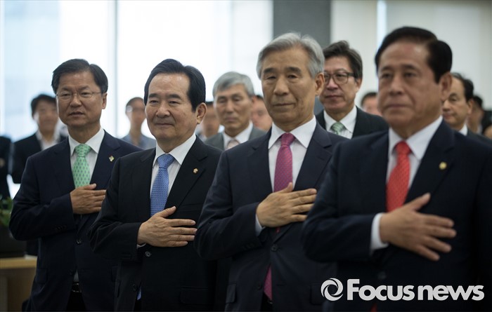 (서울=포커스뉴스) 정세균 국회의장이 14일 오전 서울 여의도 국회 의원회관에서 열린 국회도서관 박람회 개막식에 참석해 국기에 대한 경례를 하고 있다. 왼쪽부터 천정배 국민의당 공동대표, 정 의장, 이은철 국회도서관 관장, 배덕광 새누리당 의원