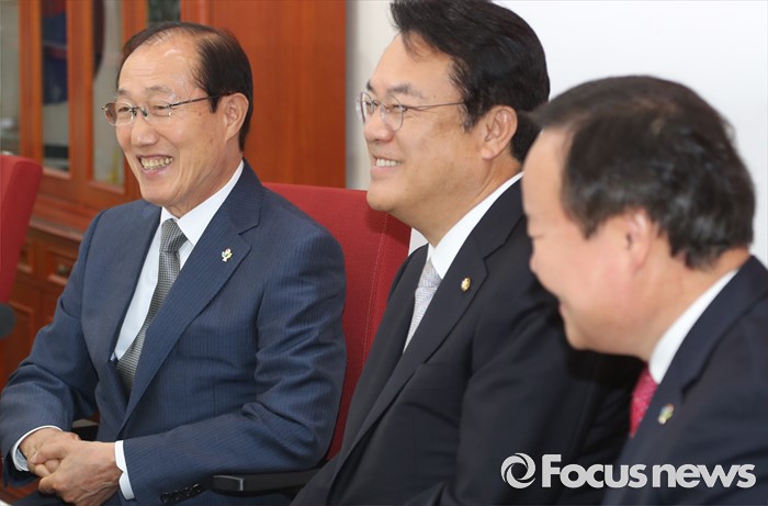 (서울=포커스뉴스) 정진석(가운데) 새누리당 원내대표가 14일 오전 서울 여의도 국회를 방문한 이원종(왼쪽) 대통령비서실장, 김재원 청와대 정무수석과 면담을 하고 있다.