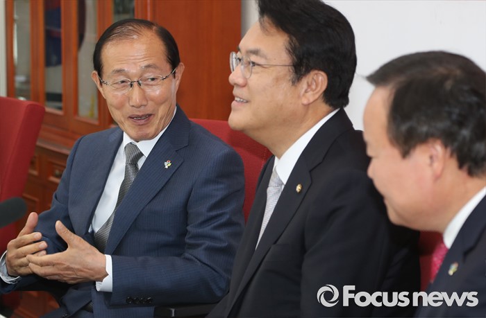 (서울=포커스뉴스) 정진석(가운데) 새누리당 원내대표가 14일 오전 서울 여의도 국회를 방문한 이원종(왼쪽) 대통령비서실장, 김재원 청와대 정무수석과 면담을 하고 있다.