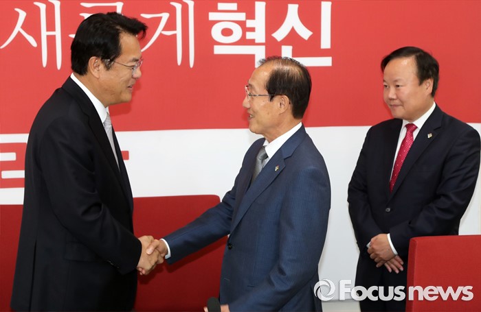 (서울=포커스뉴스) 정진석(왼쪽) 새누리당 원내대표가 14일 오전 서울 여의도 국회를 방문한 이원종(가운데) 대통령비서실장, 김재원 청와대 정무수석과 인사하고 있다.