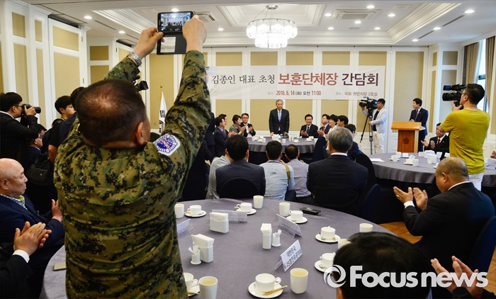 (서울=포커스뉴스) 김종인 더불어민주당 비대위 대표가 14일 오전 서울 여의도 국회 귀빈식당에서 열린 보훈단체장과의 간담회에 참석해 인사하고 있다.