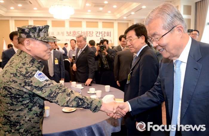 (서울=포커스뉴스) 김종인(오른쪽) 더불어민주당 비대위 대표가 14일 오전 서울 여의도 국회 귀빈식당에서 열린 보훈단체장과의 간담회에 참석한 단체 관계자들과 인사하고 있다.