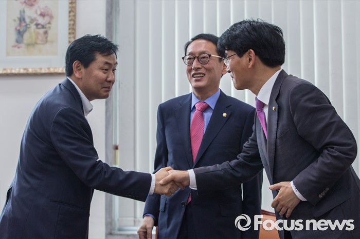 (서울=포커스뉴스) 박완주(오른쪽) 더불어민주당 원내수석부대표와 김관영(왼쪽) 국민의당 원내수석부대표가 14일 오전 서울 여의도 국회에서 열린 3당 원내수석회동에 앞서 악수 하고 있다.