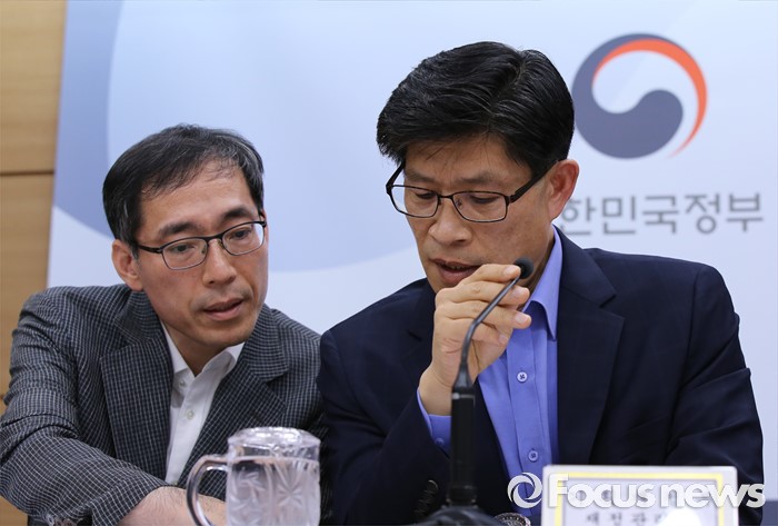 (세종=포커스뉴스) 노형욱(오른쪽) 기획재정부 재정관리관이 지난 13일 오전 정부세종청사 기재부 브리핑룸에서 열린 공공기관(에너지·환경·교육분야) 기능조정 관계부처 합동 사전브리핑에서 정기준 기획재정부 공공정책국장과 논의하고 있다.