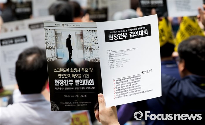(서울=포커스뉴스) 14일 오전 서울시청 앞 인도에서 민주노총 공공운수노조와 서울지하철노조 관계자들이 스크린도어 희생자 추모 및 안전인력 확보를 위한 현장간부 결의대회를 하고 있다.