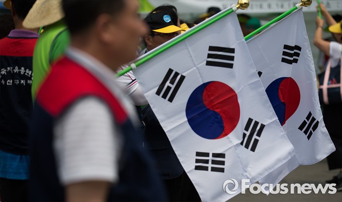 (서울=포커스뉴스) 14일 오후 서울역광장에서 열린 '북핵 규탄 및 평화통일 기원대회'에 참가한 한국자유총연맹 회원들이 태극기를 들고 있다.