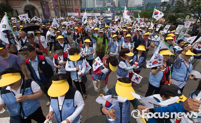 (서울=포커스뉴스) 14일 오후 서울역광장에서 열린 '북핵 규탄 및 평화통일 기원대회'에 참가한 한국자유총연맹 회원들이 북핵 폐기와 한반도 비핵화를 촉구하는 구호를 외치고 있다.