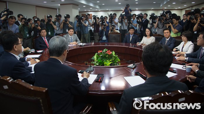 (서울=포커스뉴스) 김희옥 새누리당 혁신비상대책위원장과 김광림 정책위의장을 비롯한 혁신위원들이 14일 오후 서울 여의도 국회에서 회의를 하고 있다.
