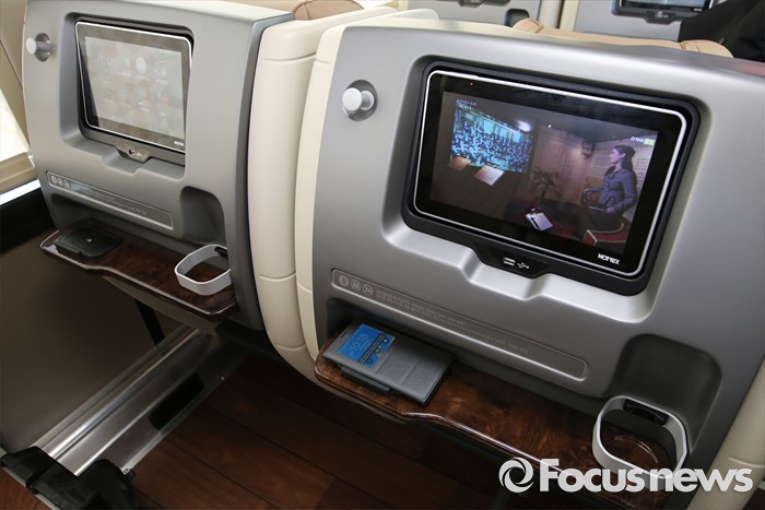 (세종=포커스뉴스) 프리미엄 고속버스 도입에 앞서 시승행사가 14일 오전 세종시 정부세종청사 제2주차장에서 열렸다. 사진은 기아자동차 뉴 그랜버드 프리미엄 골드 익스프레스 내부모습.