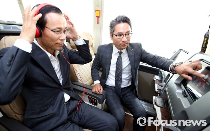 (세종=포커스뉴스) 프리미엄 고속버스 도입에 앞서 시승행사가 14일 오전 세종시 정부세종청사 제2주차장에서 열렸다. 최정호 국토교통부 2차관이 관계자로부터 기아자동차 뉴 그랜버드 프리미엄 골드 익스프레스 설명을 듣고 있다.