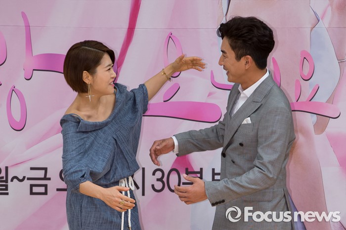 (서울=포커스뉴스) 14일 오후 서울 양천구 SBS 목동사옥에서 열린 SBS 일일드라마 '사랑이 오네요' 제작발표회에 참석한 배우 김지영(왼쪽)과 고세원이 포토타임을 갖고 있다.
