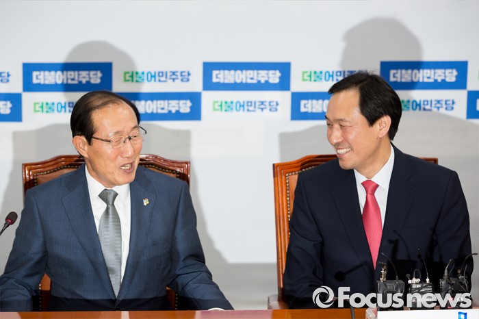 (서울=포커스뉴스) 우상호(오른쪽) 더불어민주당 원내대표가 14일 오후 서울 여의도 국회에서 이원종 대통령비서실장과 면담하고 있다.