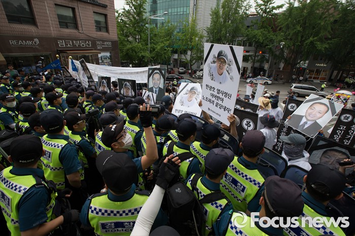 (서울=포커스뉴스) 14일 오후 유성기업 노동자 故 한광호씨의 분향소를 양재동 현대차 본사 앞으로 옮기는 꽃길 100리 행진 2일째에 참여한 노동자들이 국회를 출발해 한남동 현대차 정몽구 회장 집으로 향하던 길에 경찰과 대치하고 있다.