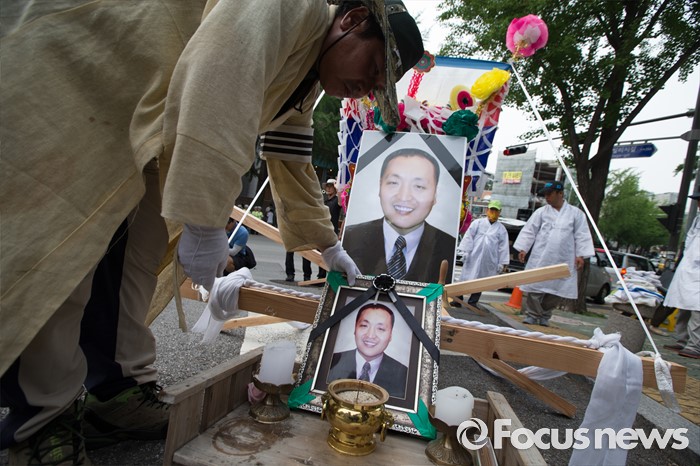 (서울=포커스뉴스) 14일 오후 유성기업 노동자 故 한광호씨의 분향소를 양재동 현대차 본사 앞으로 옮기는 꽃길 100리 행진 2일째에 참여한 노동자들이 국회를 출발해 한남동 현대차 정몽구 회장 집으로 향하던 길에 상여와 영정을 내려놓고 있다.