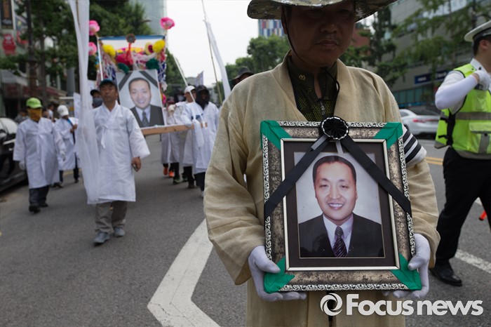 (서울=포커스뉴스) 14일 오후 유성기업 노동자 故 한광호씨의 분향소를 양재동 현대차 본사 앞으로 옮기는 꽃길 100리 행진 2일째에 참여한 노동자들이 국회를 출발해 한남동 현대차 정몽구 회장 집으로 행진하고 있다.