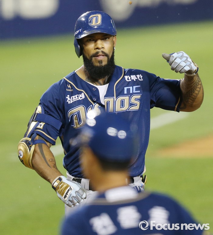 (서울=포커스뉴스) 14일 서울 잠실구장에서 열린 2016 프로야구 NC-LG 경기 6회초 1사후 NC 테임즈가 우월 솔로 홈런을 치고 전준호 코치의 환영을 받으며 홈인하고 있다.