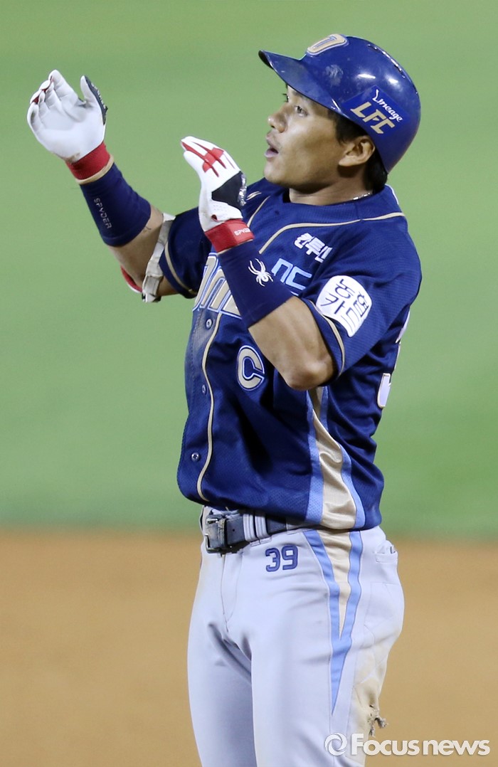 (서울=포커스뉴스) 14일 서울 잠실구장에서 열린 2016 프로야구 NC-LG 경기 9회초 무사 만루에서 NC 이종욱이 2타점 중전 안타를 치고 1루에서 환호하고 있다.