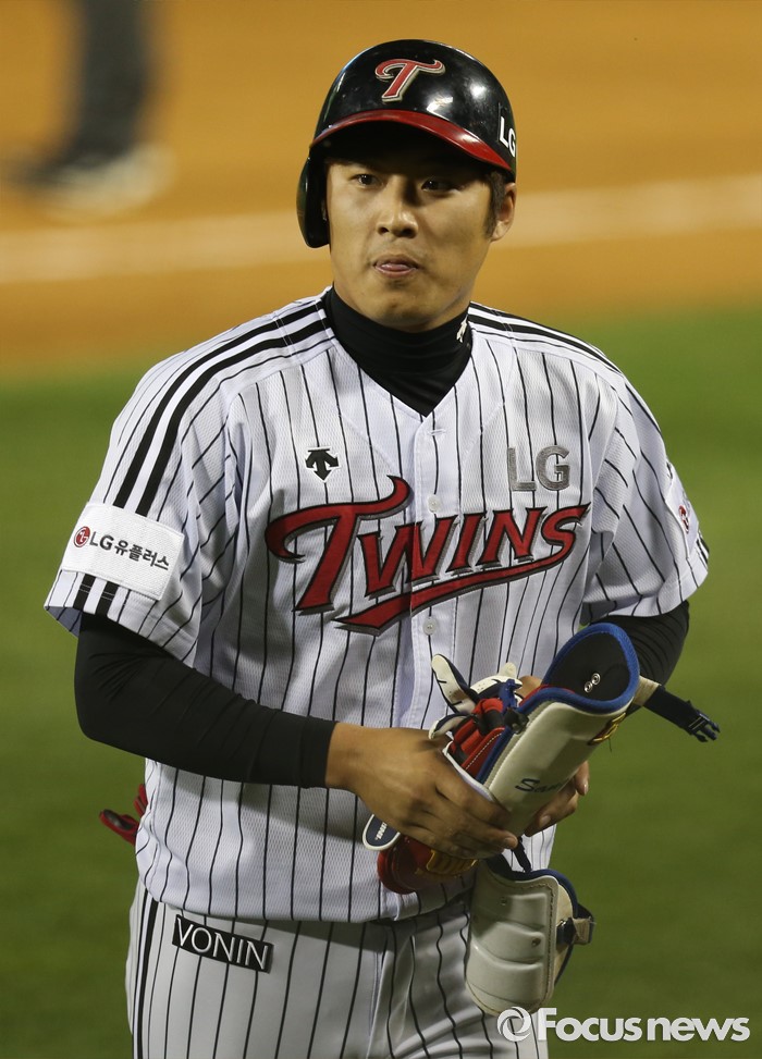 (서울=포커스뉴스) 14일 서울 잠실구장에서 열린 2016 프로야구 NC-LG 경기 9회말 무사 1,2루에서 LG 대타 서상우가 1타점 우전 안타를 치고 대주자와 교체돼 덕아웃으로 들어가고 있다.