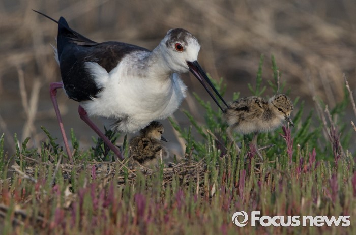 (인천=포커스뉴스)먼저 부화한 장다리물떼새 새끼들이 아빠 품에서 휴식을 취하다가 밖으로 나오고 있다.