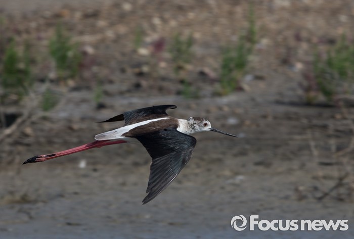 (인천=포커스뉴스) 장다리물떼새가 인천시 영종도 매립지내 작은 습지의 사방이 물로 에워 싼 조그만 뭍에 상륙하고 있다.