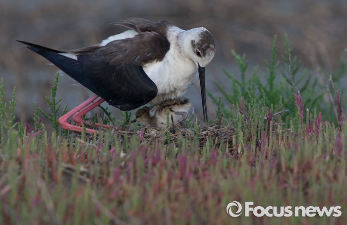 (인천=포커스뉴스) 둥지 근처에서 놀던 장다리물떼새 새끼가 나머지 알을 품고 있는 아빠 품속으로 들어가고 있다.