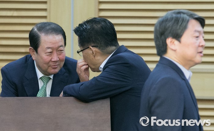 (서울=포커스뉴스) 15일 오전 서울 여의도 국회 의원회관에서 열린 15차 국민의당 정책역량강화 집중 워크숍에 참석한 박주선(왼쪽) 국회 부의장과 박지원(가운데) 원내대표가 대화하고 있다. 오른쪽은 안철수 상임공동대표.