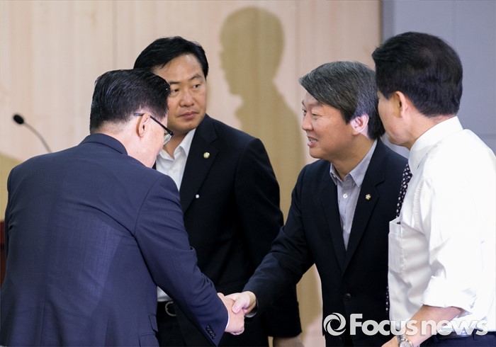 (서울=포커스뉴스) 15일 오전 서울 여의도 국회 의원회관에서 열린 15차 국민의당 정책역량강화 집중 워크숍에 참석한 박지원(왼쪽부터) 원내대표, 김관영 원내수석부대표, 안철수 상임공동대표, 정동영 의원이 인사하고 있다.