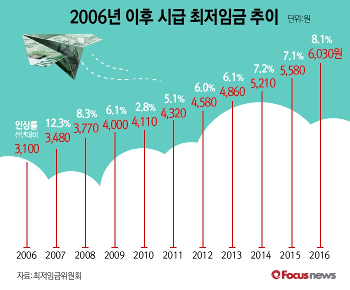 (서울=포커스뉴스)최저임금위원회 자료를 보면 2016년 시급 최저임금은 전년 대비 8.1% 오른 6,030원으로 28일 발표되는 내년도 최저임금 인상에 관심이 모이고 있다.
