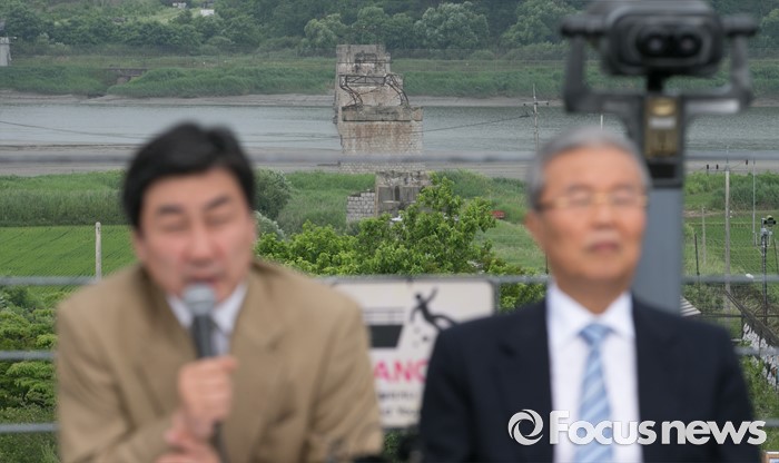 (파주=포커스뉴스) 15일 오전 경기도 파주 임진각 통일전망대에서 열린 더불어민주당 비상대책위원회의에 참석한 김종인(오른쪽) 비대위 대표와 이종걸 비대위원 모습 뒤로 임진각 동쪽철교가 보이고 있다.