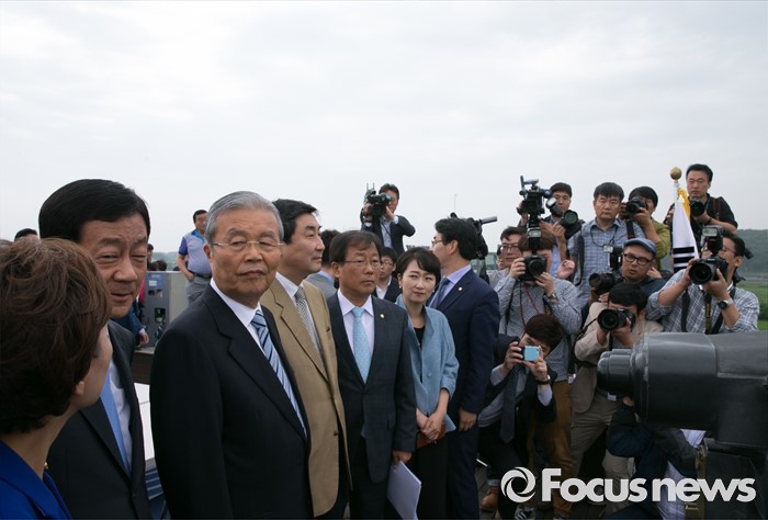 (파주=포커스뉴스) 15일 오전 경기도 파주 임진각 통일전망대에서 더불어민주당 비상대책위원회의를 마친 김종인 비대위 대표와 의원들이 임진각 철교 주변을 바라보고 있다.